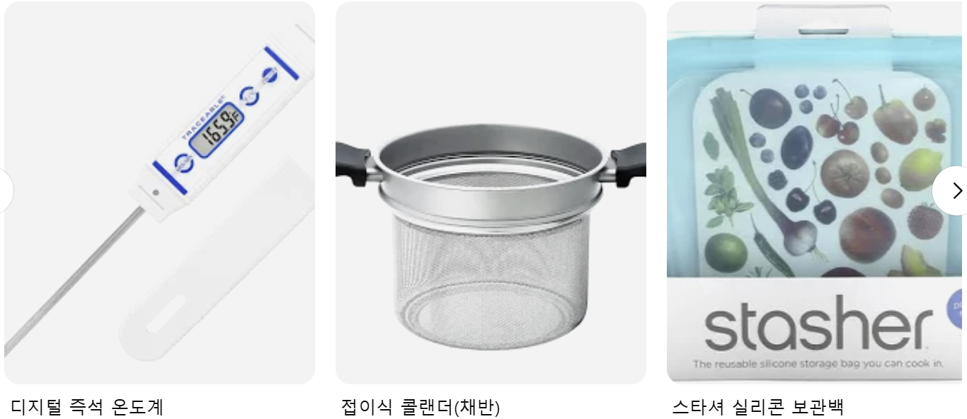 | 실리콘 보관백 | 재사용·환경성·내구성 | 식기세척기 OK, 지퍼 밀봉 | 냉장·해동·수비드 |